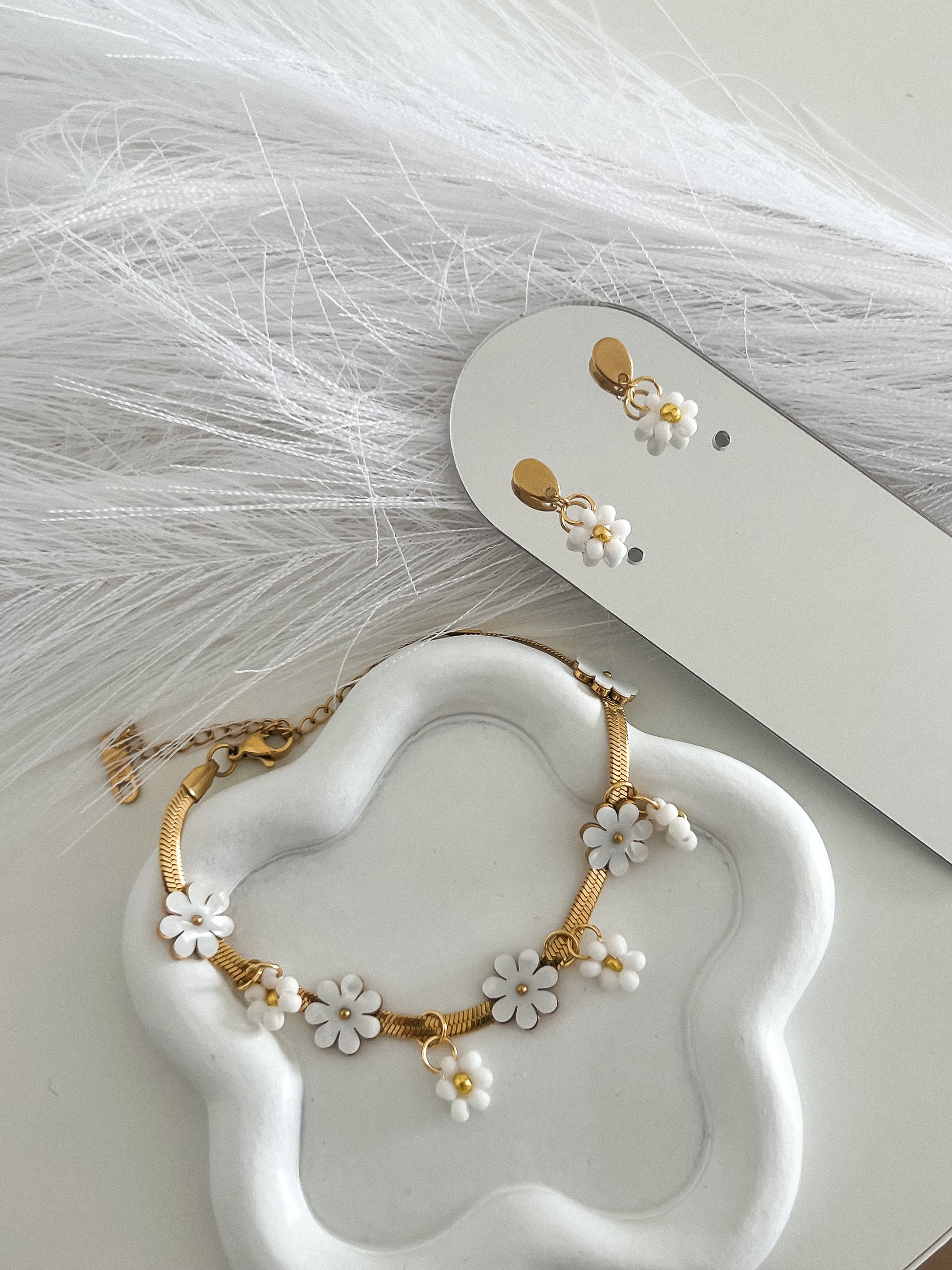 conjunto pulseira e brincos em aço inoxidável flores margaridas